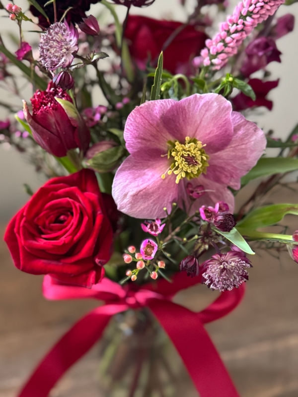 A cute, romantic jam jar for your cutie on Valentines Day. Perfect for the bedside table where the scent of freesia and roses can be enjoyed.