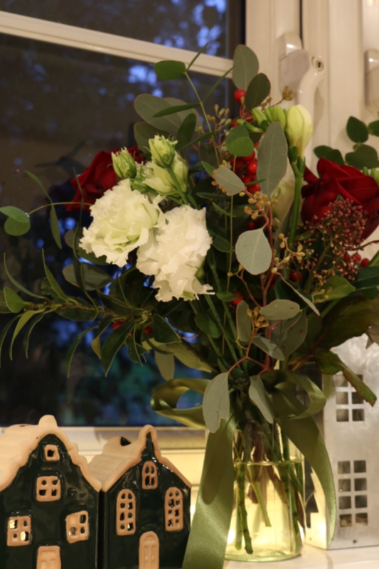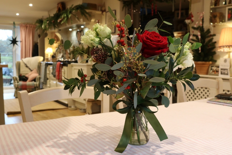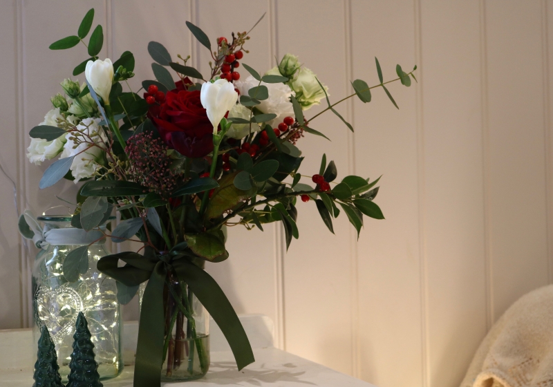 Christmas jam jar filled with flowers, perfect for adding a small touch of seasonal cheer. Arranged with fresh winter blooms and greenery in a clear glass jar, it’s a lovely, understated decoration or easy Christmas gift. Clean, natural, and effortlessly festive. 🎄