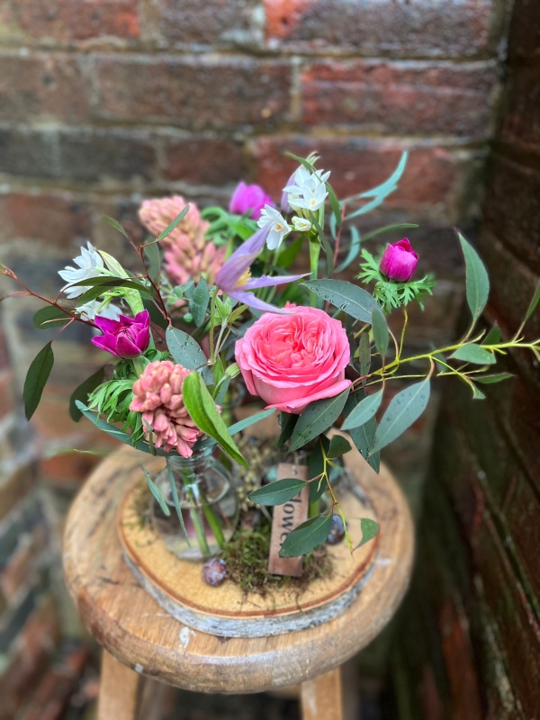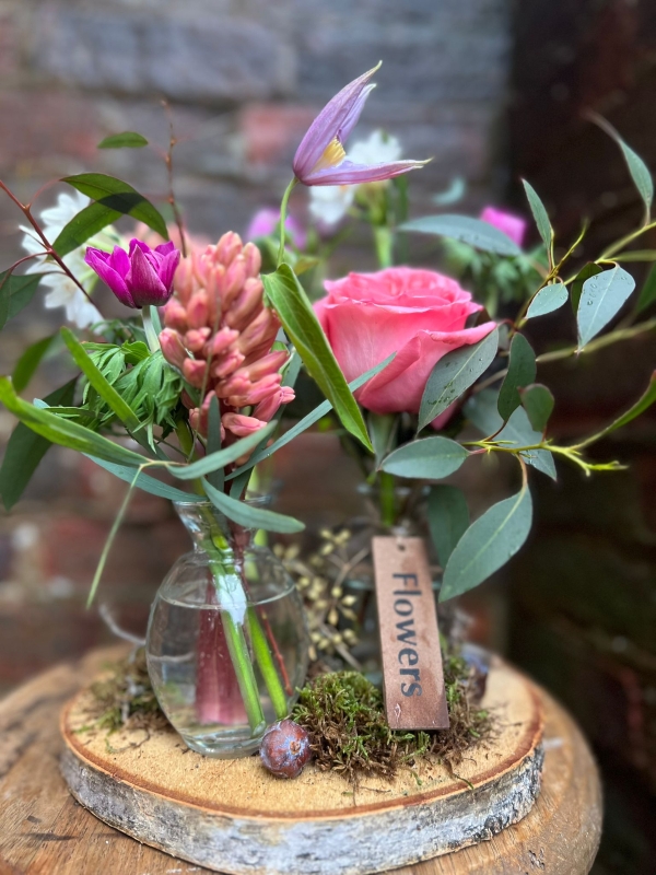 Arranged in a petite glass vase and presented on a rustic wood base with moss accents, this piece works well as a desk accent, shelf styling element, or small-space centerpiece.