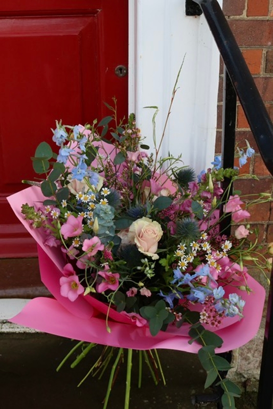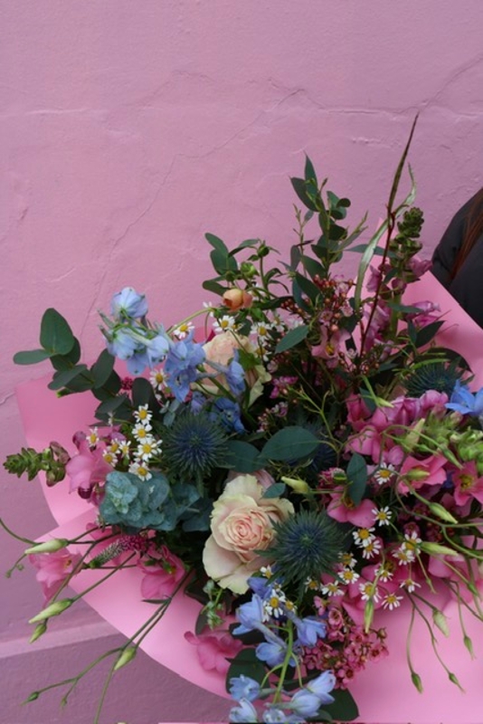 Celebrate Mum with the gentle beauty of Mother’s Meadow — a hand-tied bouquet inspired by wild garden blooms and soft spring mornings. Featuring blush pink roses, dainty daisies, airy blue delphinium, and textured thistle, this arrangement is wrapped in romantic rose-pink paper and finished with fresh eucalyptus for a natural, fragrant touch.
