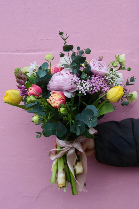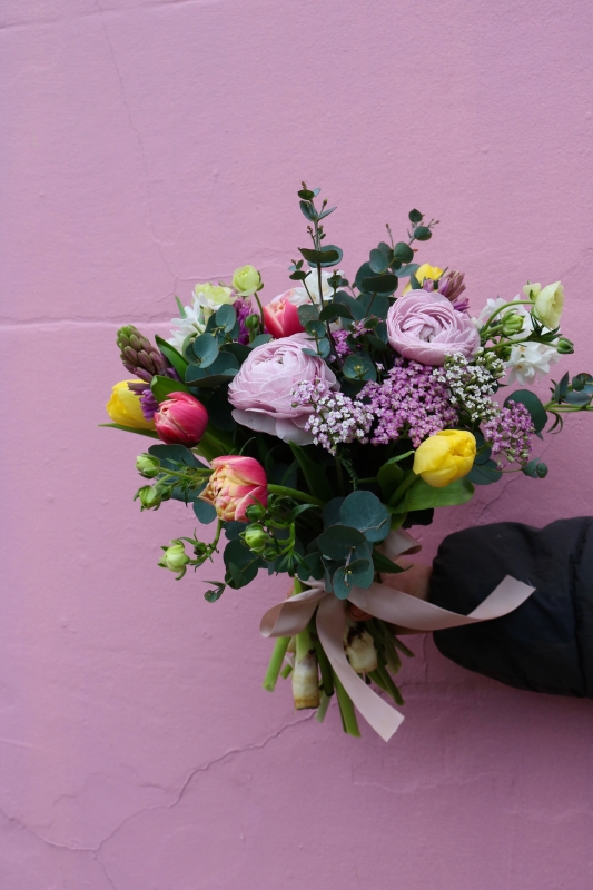 Celebrate the woman who nurtures everything she touches with Her Garden of Grace — a bouquet inspired by the quiet strength and gentle beauty of motherhood. Featuring romantic blush ranunculus, joyful yellow tulips, delicate pink blooms, and fresh eucalyptus, this hand-tied arrangement feels like spring gathered just for her.