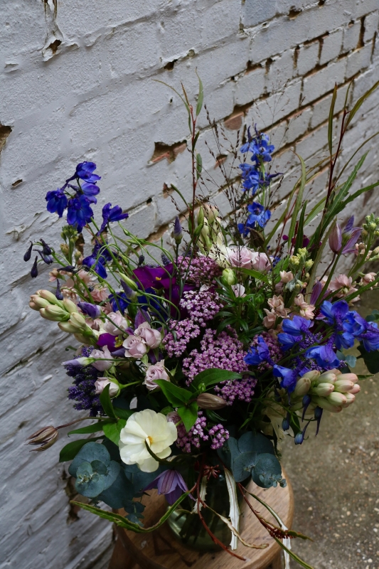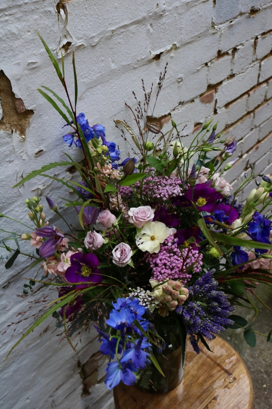 Rich, romantic, and beautifully untamed, Midnight Garden for Mom is a celebration of her depth and strength. Featuring velvety purples, soft blush roses, delicate pink clusters, creamy focal blooms, and striking blue delphinium, this arrangement feels like a twilight garden gathered just for her.